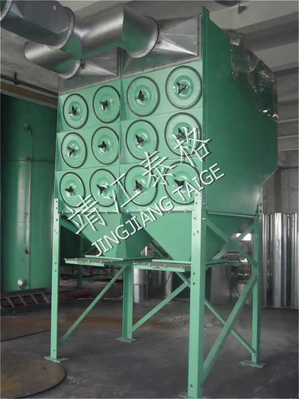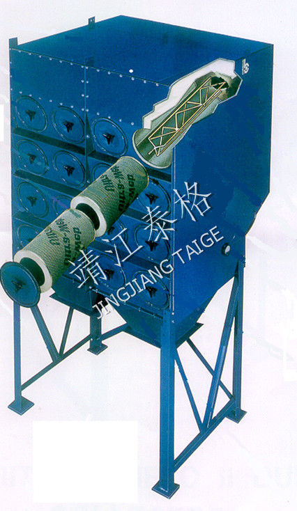 滤筒在除尘器中的布置很重要,滤筒可以垂直布置在箱体天花板上,也可以倾斜布置在花板上,用螺栓固定,并垫有橡胶垫,花板下部分为过滤室,上部为净气室。