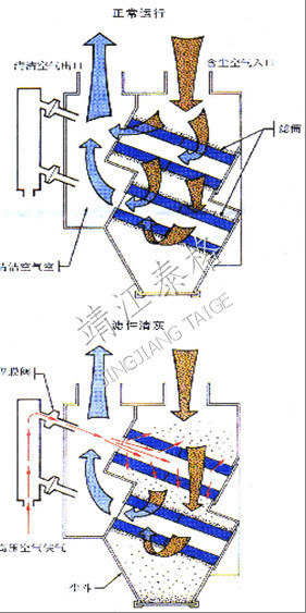 含尘气体进入除尘器灰斗后,由于气流断面积突然扩大,气流中一部分颗粒粗大的尘粒在重力和惯性力作用下沉降下来,粒度细、密度小的尘粒进入过滤室后,通过布朗扩散和筛滤等综合效应,使粉尘沉积在滤料表面,净化后的气体进入净气室由排气管经风机排出。